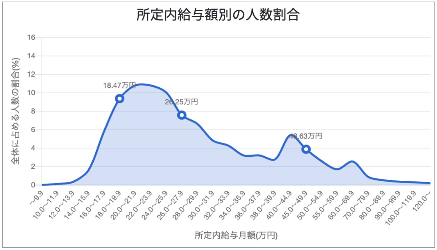 平均年収が約481万円(月給換算で約40万円)と聞くと高く感じるかもしれませんが、実際には、月給20万〜25万円(年収で300万程度)の人が大多数を占めています。