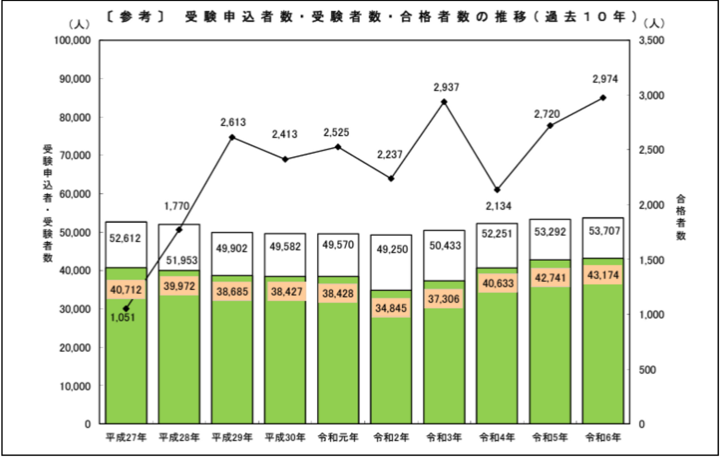 過去10年の合格率の平均値は5.9%、中央値は6.4%です。令和6年度試験においても、概ね例年通りの結果となりました。