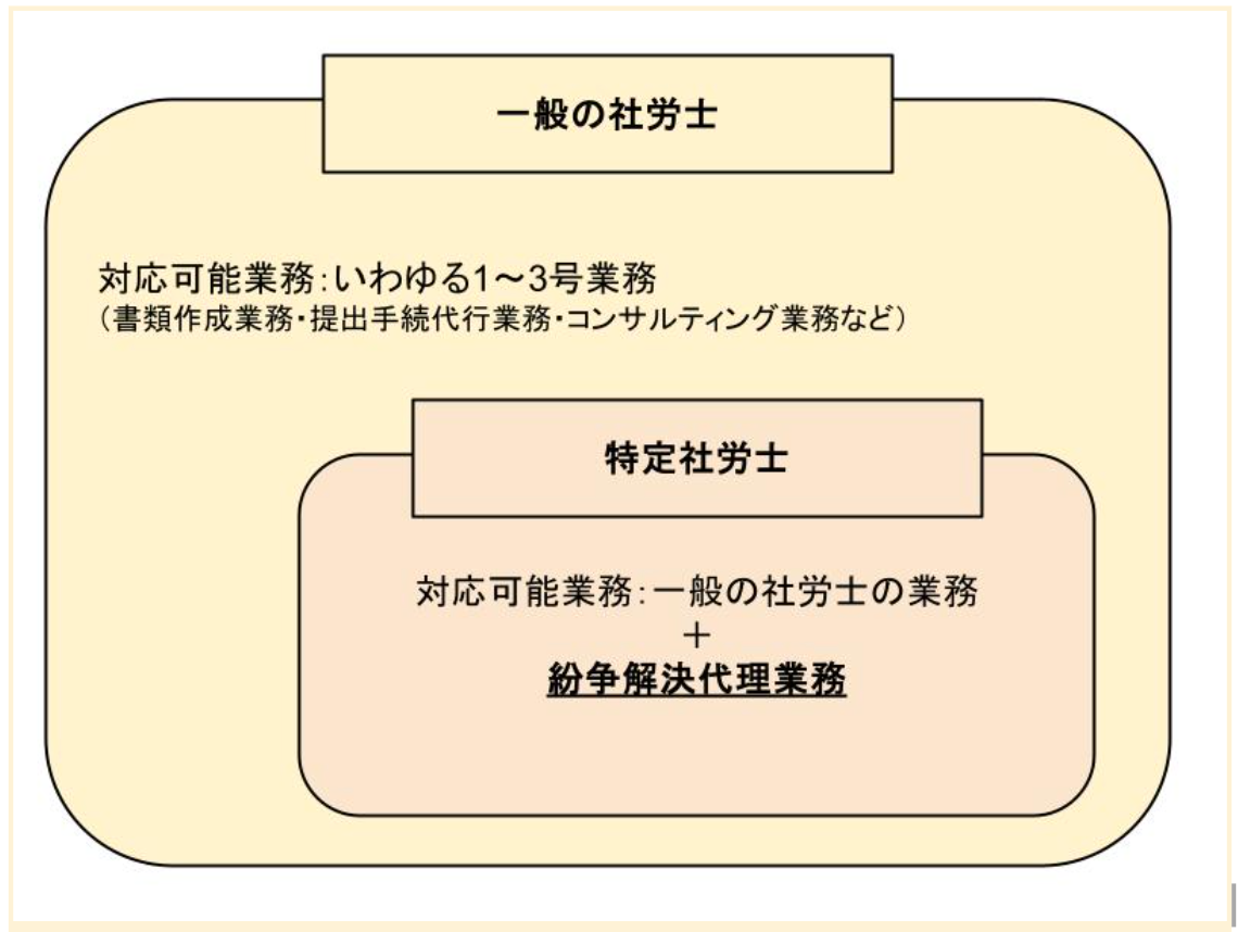 特定社労士とは、特別研修を経て紛争解決手続代理業務試験に合格し、かつその旨が社労士会連合会の登録に付記された社労士のことをいいます。労働紛争の代理業務に関しては、社労士のなかでも特定社労士しか行うことができません(弁護士を除く)。
