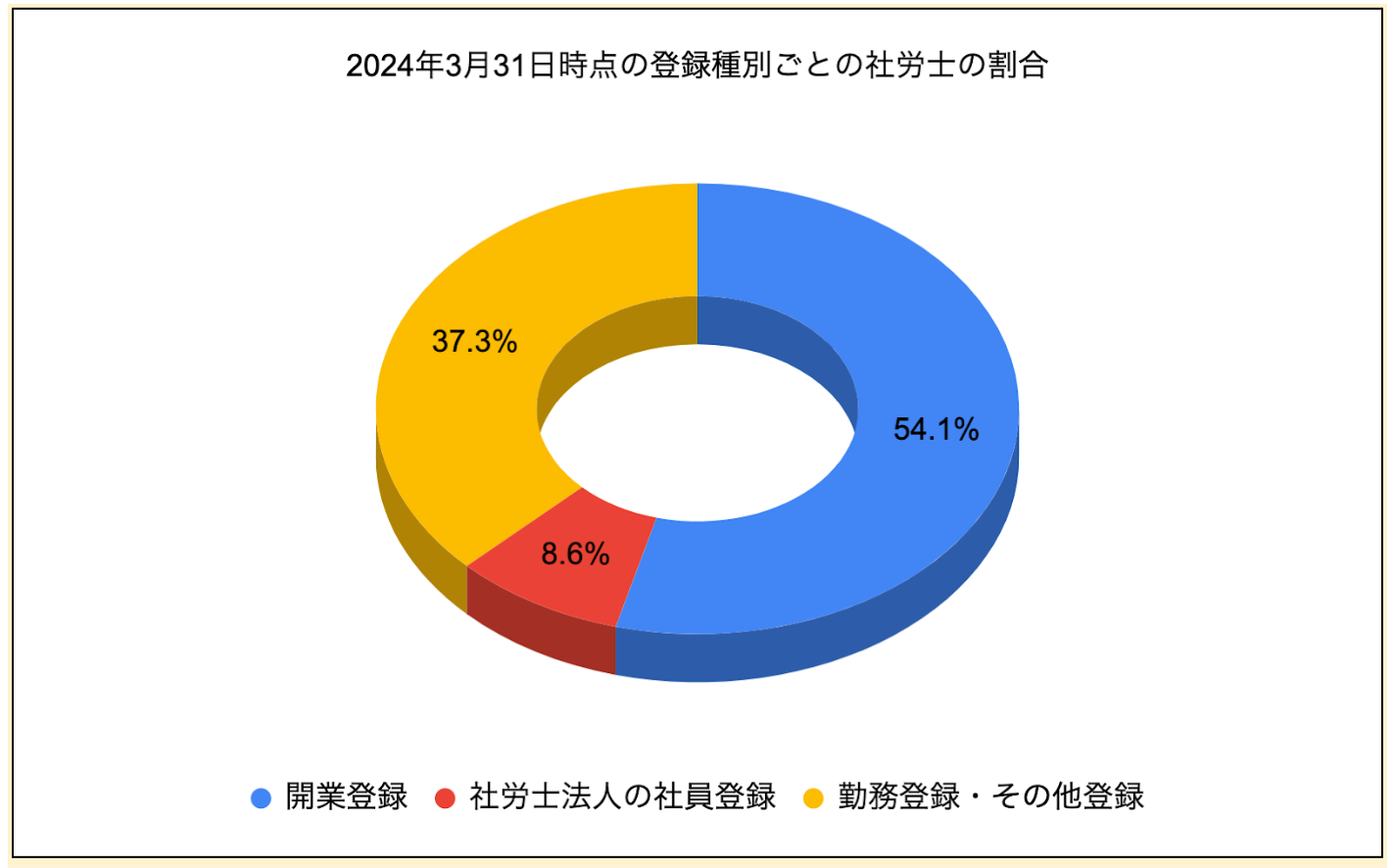 2024年3月31日時点の社労士登録者数は45,386人です。内訳としては開業登録が24,549人(54.1%)、社労士法人の社員登録が3,915人(8.6%)、勤務登録とその他登録の合計が16,922人(37.3%)となっています。