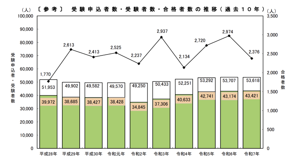 受験者層の規模は、コロナ禍での落ち込みから回復し、受験者数および受験申込者数は53,000人前後で安定しており、社労士資格への関心は高い水準で維持されていると見られます。
