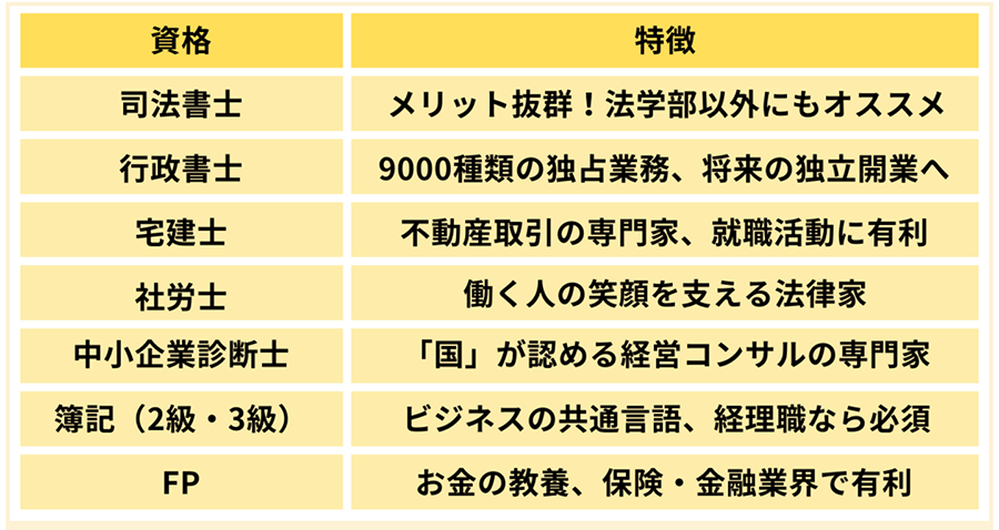 いずれの資格も、就職活動で役立ったり、収入アップにつながったりと、卒業後に役立つ資格ばかりです。