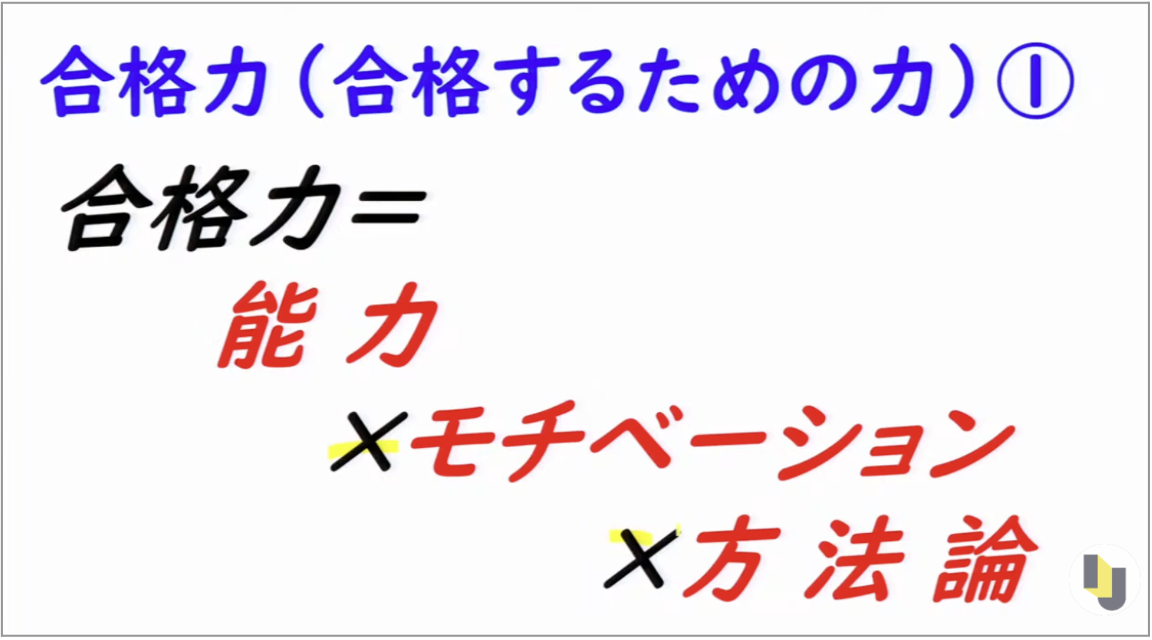 • 司法書士試験の合格力は、「能力」「モチベーション」「方法論」の掛け算で決まります。能力やモチベーションが高くても、正しい「方法論」が間違っていると合格力はゼロになりかねません。