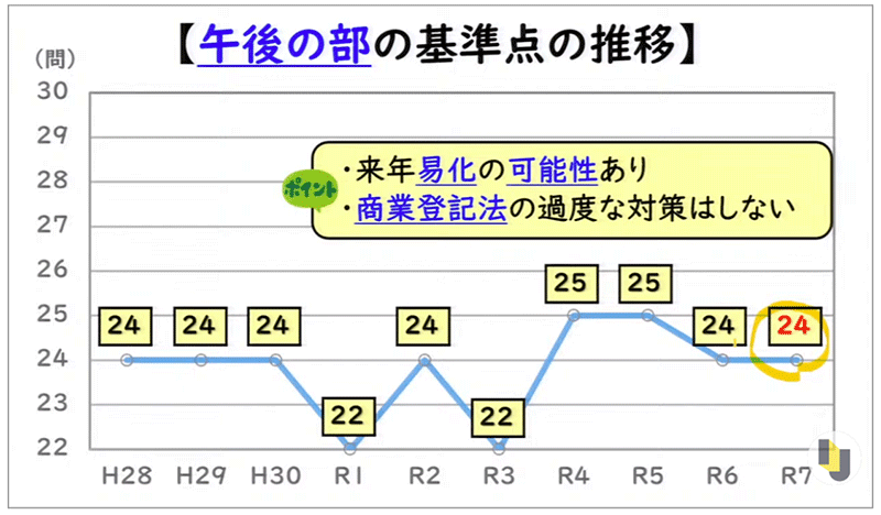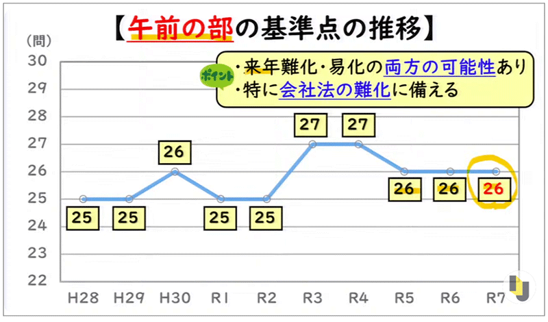 ・来年については、基準点が25問レベルへの難化、または27問レベルへの易化の両方の可能性があります。特に会社法が難化する可能性があり、基礎を固めた上で周辺の細かな知識まで押さえる必要があります。