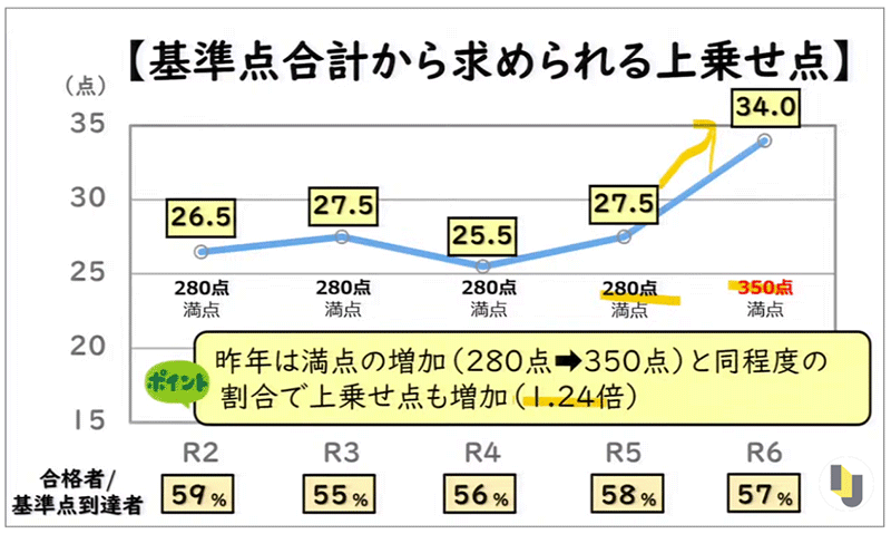 2024年から急激に上乗せ点が高くなっているのは、配点変更があったからです。記述式の配点変更によって、満点が1.25倍に増加したため、それに応じて上乗せ点も同程度(1.24倍)増加しました。
