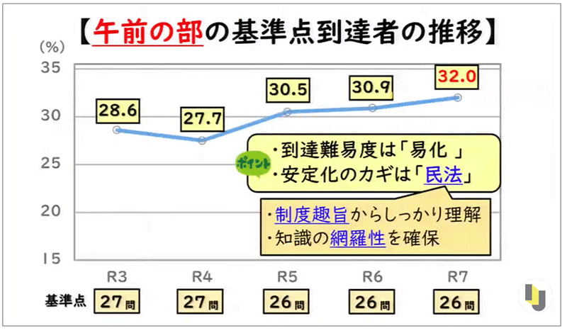 では、午前の部の得点を安定させるためにはどうすればいいのか。その安定化のカギを握るのが民法です。民法で18問近く取れていけば、午前の部の得点は安定しやすく、基準点割れのリスクも回避しやすくなっていきます。