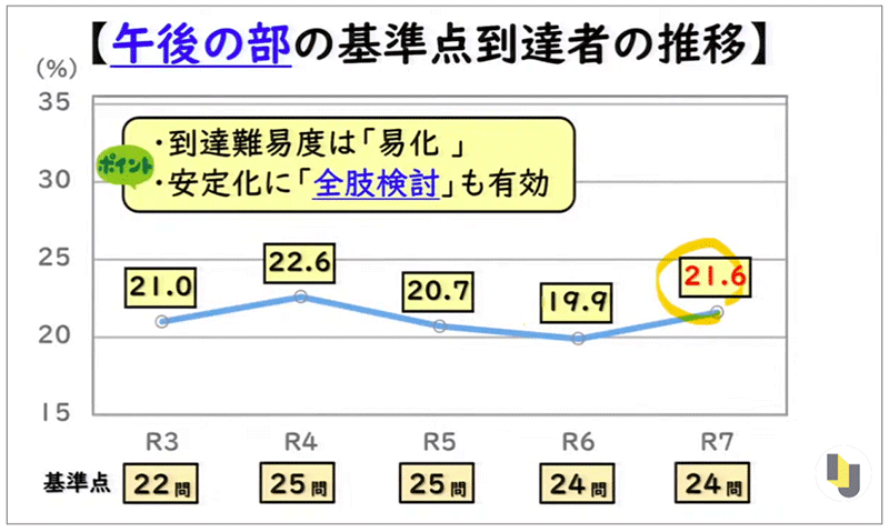 昨年(令和6年)の30.9%からやや上がっており、「基準点に到達する難易度」については易化したと言えるでしょう。