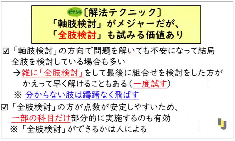 そのため、最初から全肢を見て、最後に組み合わせを検討する全肢検討の方が、それぞれの肢の行き来がない分、かえって早く解ける可能性があるのです。