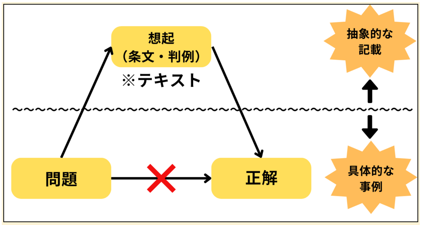 「問題」で問われている「具体的な事例」を、テキストに書かれている「抽象的な記載」へと結びつけて、「正解」を導くトレーニングを行うのです。