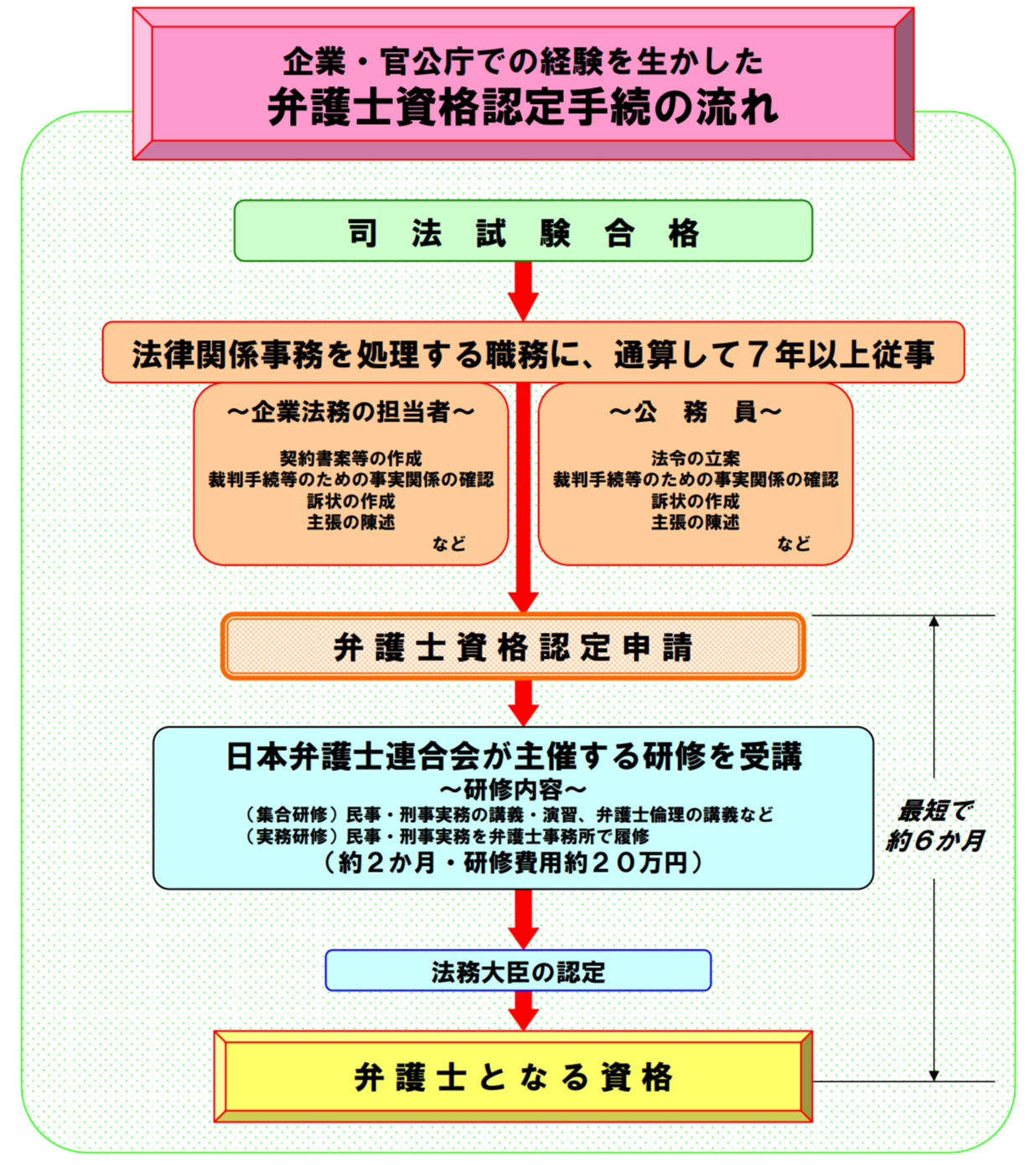 要件が少し分かりづらいですが、司法修習を受けずに弁護士になるには、司法試験合格後に企業法務や公務員、議員や法律学教授など一定の職に通算5年〜7年従事し、特定の研修を修了すれば、法務大臣の認定を受けることができます。