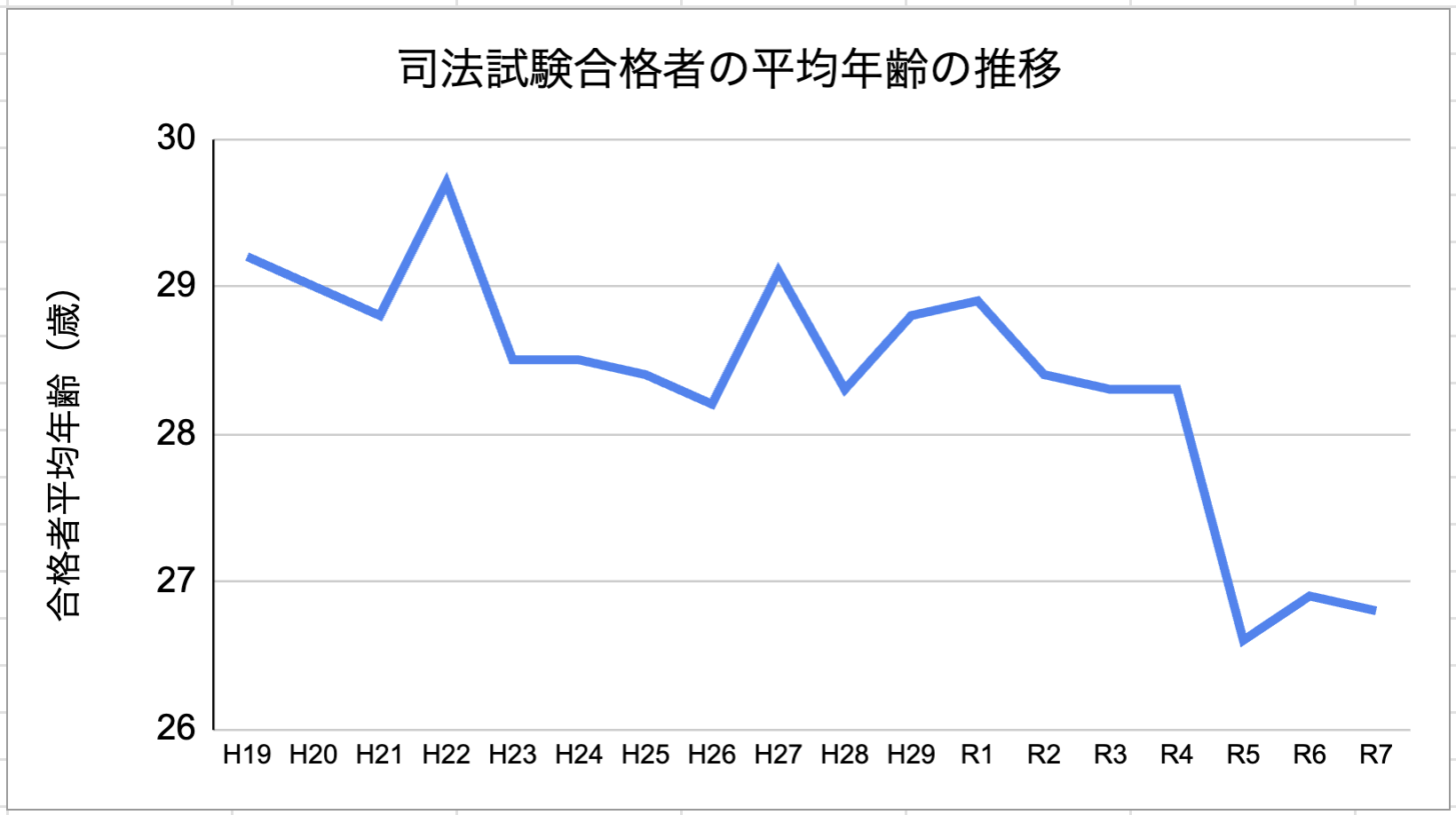 2025年度(令和7度)司法試験合格者の平均年齢は26.8歳でした。これは、現行制度開始以来最も若かった2023年度とほぼ変わらない結果です。