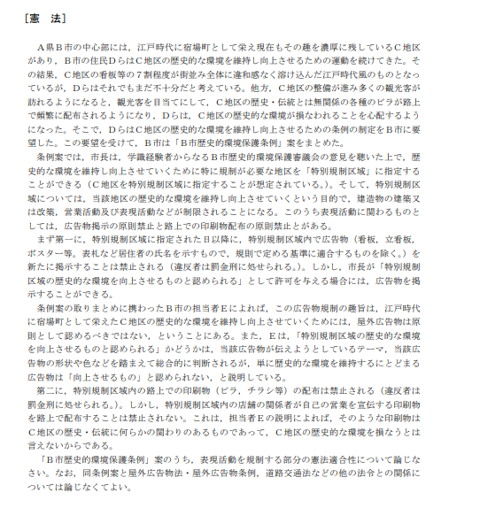 このように、ある法律や行為が憲法に適合するかどうかを問うような問題形式となっており、自分の主張だけではなく、相手の主張や判例も加味した解答をする必要があります。