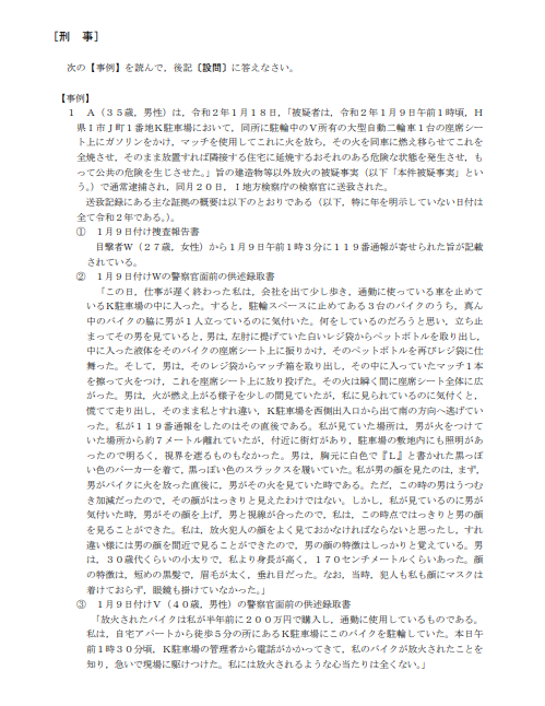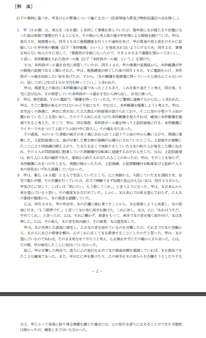 刑法の問題はかなり長い詳細な事例問題になっており、問題としては「甲及び乙の罪責について論じなさい」というような単純な出題形式であることが多いです。