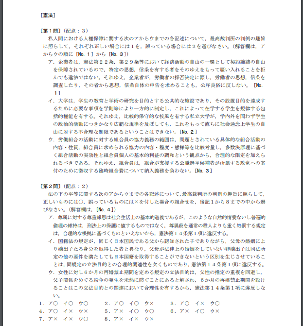 例えば、3つの肢のうち2つの肢の正誤がわかれば消去法で解答できるような、いわゆる試験テクニックが使えない問題が多いのも憲法の特徴のひとつとなるでしょう。