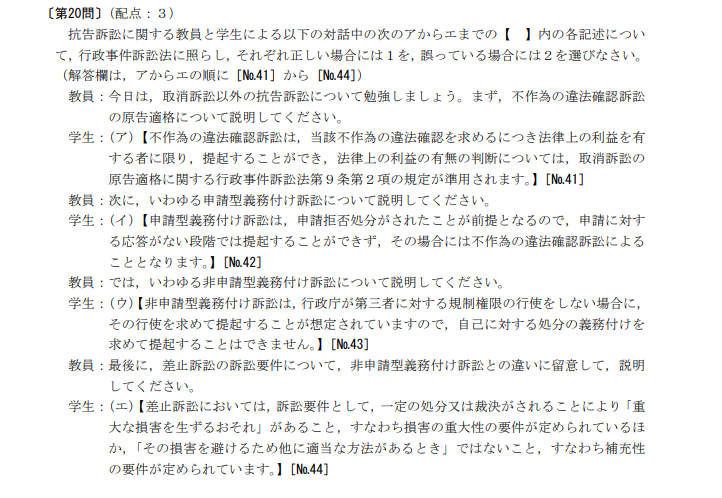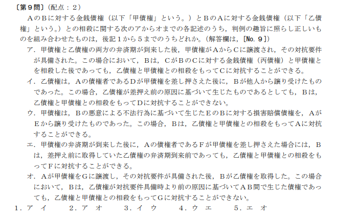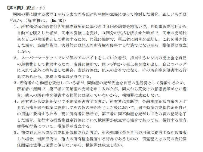 出題形式は多種多様であり、上記のように引用された判例知識を問うものから、「正しいものの組み合わせを答えるもの」、「正しいものに1誤っているものに2を選ぶもの」、「正しいものの個数を答えるもの」などがあります。
