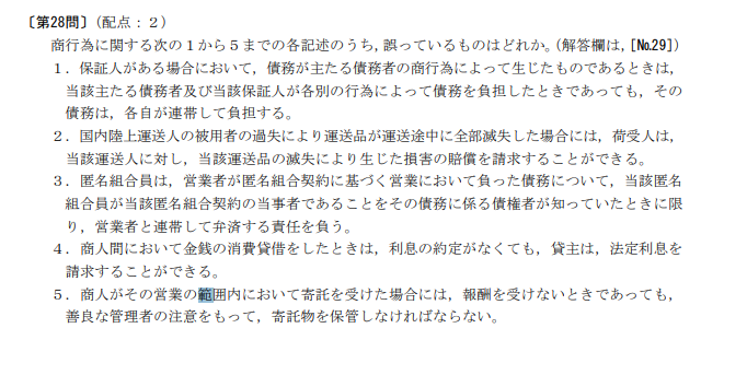細かい条文知識が問われる商法、会社法の分野からの出題がほとんどで、商法総則・商行為法分野および手形・小切手法分野からは毎年2~3問程度出題されることが多いです。